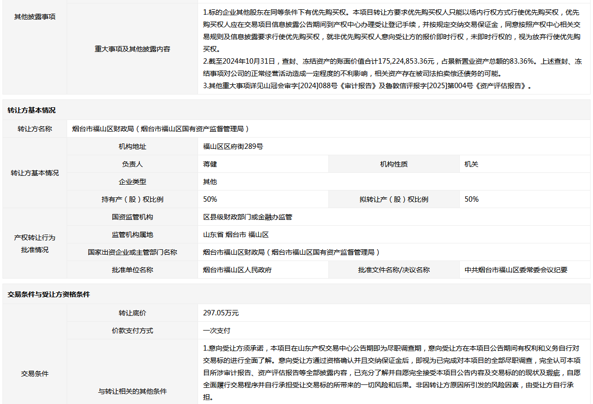 - 轉(zhuǎn)讓方: 煙臺(tái)市福山區(qū)財(cái)政局(煙臺(tái)市福山區(qū)國有資產(chǎn)監(jiān)督管理局)