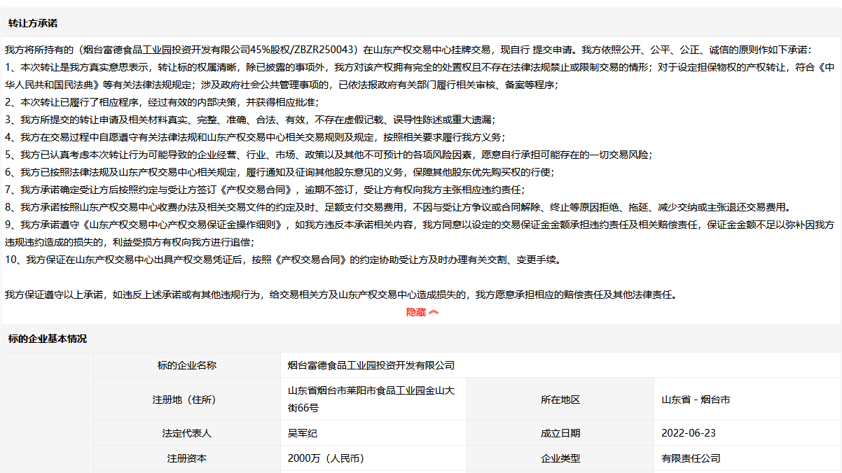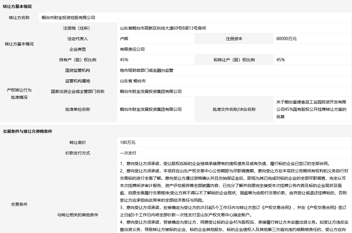 煙臺(tái)富德食品工業(yè)園投資開(kāi)發(fā)有限公司45%股權(quán)