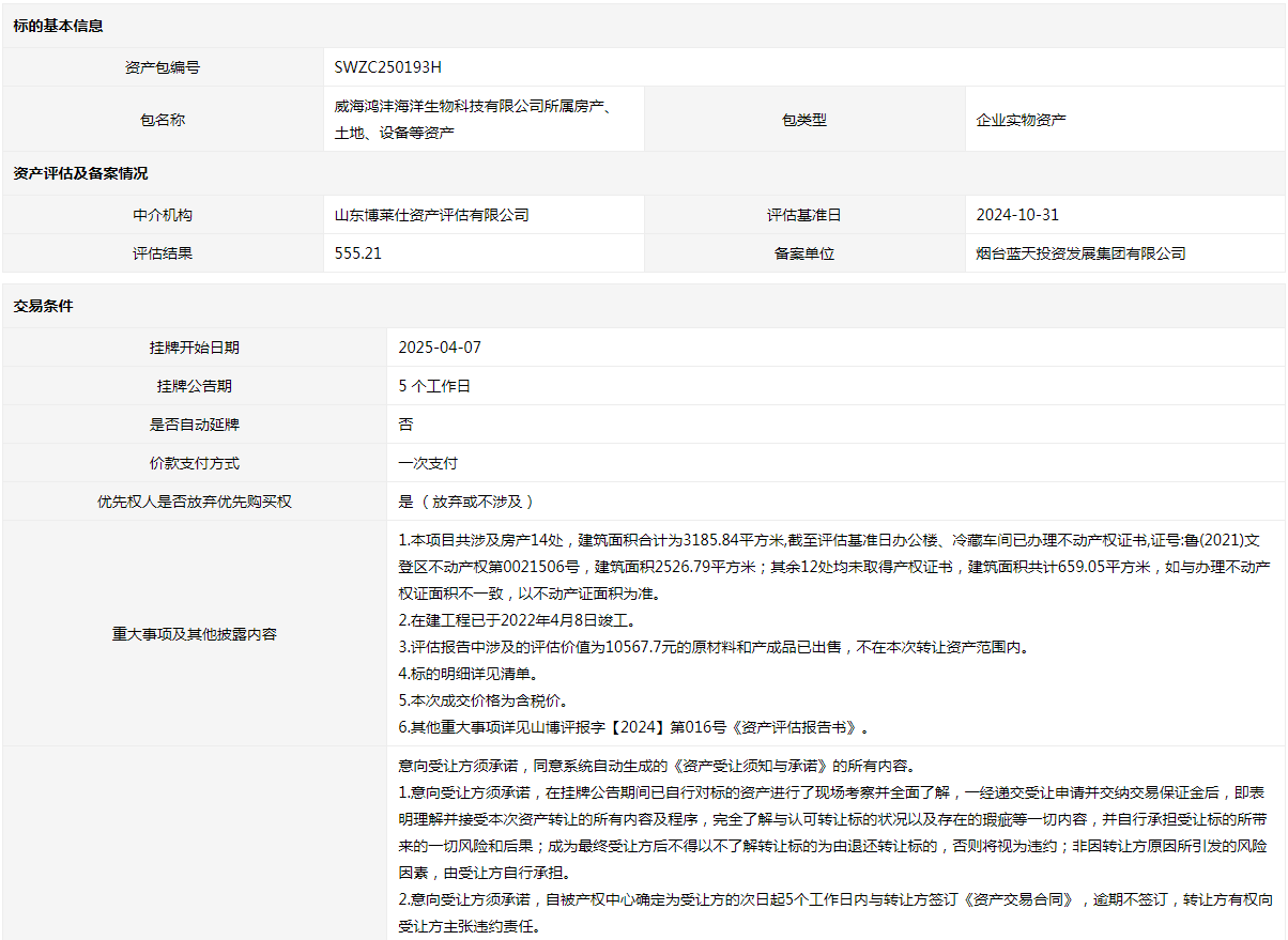 威海鴻灃海洋生物科技有限公司所屬房產、土地、設備等資產