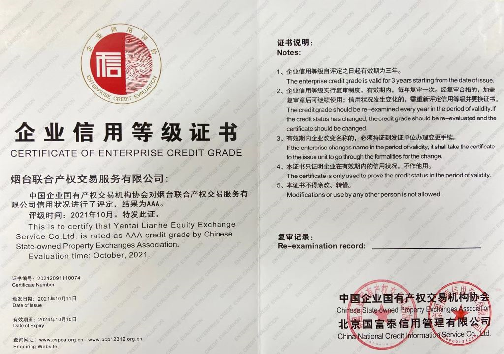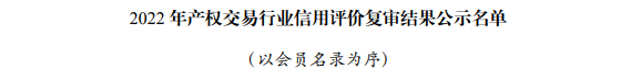 2022年產(chǎn)權(quán)交易行業(yè)信用評(píng)價(jià)復(fù)審結(jié)果在全國(guó)行業(yè)信用公共服務(wù)平臺(tái)和中國(guó)產(chǎn)權(quán)網(wǎng)進(jìn)行公示,煙臺(tái)聯(lián)合產(chǎn)權(quán)在協(xié)會(huì)信用評(píng)價(jià)復(fù)審中,繼續(xù)維持AAA級(jí)評(píng)定不變。