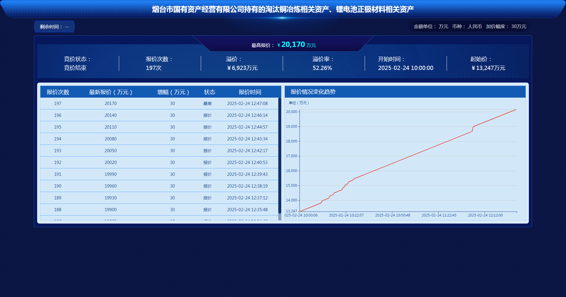2月24日,“煙臺市國有資產(chǎn)經(jīng)營有限公司持有的淘汰銅冶煉相關(guān)資產(chǎn)、鋰電池正極材料相關(guān)資產(chǎn)項(xiàng)目”在山東產(chǎn)權(quán)交易中心以網(wǎng)絡(luò)競價(jià)方式成功出讓。此次交易歷經(jīng)197輪激烈競價(jià),持續(xù)近3小時(shí),最終成交金額定格在20170萬元,高于評估價(jià)8980萬元,較掛牌價(jià)溢價(jià)6923萬元,溢價(jià)率高達(dá)52.26%,成功創(chuàng)下煙臺聯(lián)合產(chǎn)權(quán)2025年首季資產(chǎn)盤活的“開門紅”。